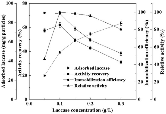 where IE is the immobilization efficiency (%) of laccase; Ct is the protein concentration (mg/mL) of supernatant after adsorption; and C0 is the initial protein concentration (mg/mL) of laccase solution.