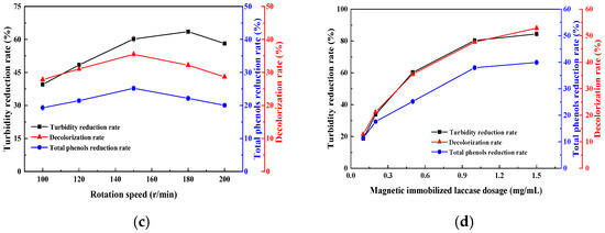 Figure 2c shows that the clarification effect of sugarcane juice first increased and then decreased with an increase in rotational speed. When the rotation speed was 150 r/min, the total phenol degradation rate reached a maximum of 25.2%, and the color removal rate of sugarcane juice also reached a peak of 35.5%. When the rotational speed is increased, the contact collision probability between the immobilized laccase and the substrate is increased, and the catalytic efficiency of the immobilized laccase to the total phenol is increased. However, when the rotation speed is further increased, the high rotation speed causes the sugarcane juice solution to produce too high a shear force on the laccase, causing a loss of laccase activity. Thus, the total phenol degradation and decolorization rates are reduced to a certain extent. When the rotation speed was 180 r/min, the turbidity decreased most significantly to 63.6%, which was slightly higher than the 60.2% observed at 150 r/min. The main reason for this is that the fine particles in the suspension could promote the formation of clusters with an increase in rotation speed, so as to better remove them [31]. When the rotation speed continued to increase, excessive shear force was unfavorable for the stable formation of clusters and laccase activity. Therefore, in order to obtain a better clarification effect and better retain the enzyme activity of immobilized laccase, 150 r/min was selected as the optimal speed of magnetic immobilized laccase to clarify sugarcane juice in this study.
