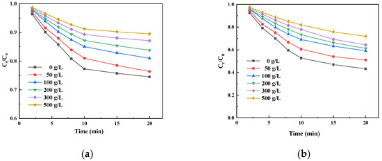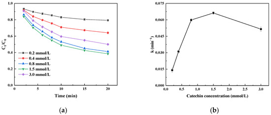 The catechin degradation rate with immobilized laccase first increased and then decreased with an increase in the catechin concentration (Figure 8a). When the catechin concentration was 1.5 mmol/L, the degradation rate was the highest; that is, Ct/C0 was the lowest. This is mainly due to an increase in the initial concentration, which increases the chance of contact between the immobilized laccase and the catechin molecule. Due to the fact that the inhibition of immobilized laccase by sucrose is dominated by competitive inhibition, increasing the concentration of substrate is beneficial to releasing the inhibition of sucrose and improving the catalytic efficiency. When the catechin concentration was further increased, the catechin degradation rate decreased and Ct/C0 increased, which may be because too many catechin molecules could aggregate and some molecules could not touch the active site of the immobilized laccase; more oxidation products can also produce certain toxicity against the immobilized laccase, an effect of catalytic oxidation degradation [39]. The k values tended to first increase and then decrease with increasing substrate concentration (Figure 8b), implying that the initial degradation efficiency of catechins also tends to first increase and then decrease with increasing substrate concentration; the initial degradation rate constant was maximal at a catechin concentration of 1.5 mmol/L, reaching 0.0663 min−1.