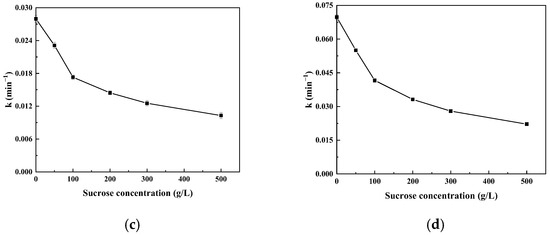 Figure 4 shows that with an increase in the sucrose concentration, the oxidation of catechins by free and immobilized laccase gradually decreases, which is mainly due to the inhibition of laccase activity with the increase in sucrose concentration. On the other hand, the viscosity of the solution increases with the increase in sucrose concentration, which reduces the diffusion rate of laccase and substrate, increases the mass transfer resistance, and reduces the catalytic rate of laccase [33]. Figure 4b,d indicate that the k value decreases with an increase in sucrose concentration, and the initial degradation rate of catechin by free and immobilized laccase shows a decreasing trend. These results are consistent with the changes in catechin oxidation with the sucrose concentration shown in Figure 4a,b.