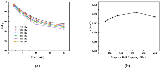 Time profile (a) and initial velocity constant (k; (b)) of catechin degradation catalyzed by immobilized laccase under different frequencies of magnetic field.