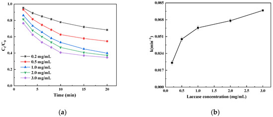 Both catechin degradation rates showed an increasing trend when the immobilized laccase amount was increased from 0.2 mg/mL to 3 mg/mL (Figure 7a); as the catechin degradation rate increased with the immobilized laccase amount, the number of catalytically active sites of catechin degradation increased. When the amount of immobilized laccase was 1 mg/mL, the catechin degradation rate was 61.1% in 20 min, while when the amount of immobilized laccase was 3 mg/mL, the catechin degradation rate was 66.2% in 20 min; this small increase in the degradation rate may be due to the decrease in the substrate concentration in the system during the middle and late stages of the reaction, and the decrease in the catalytic oxidation rate may be due to the incomplete saturation of immobilized laccase as a result of excessive dosage [38]. The k value showed an increasing trend with an increase in the amount of immobilized laccase, implying that increasing the amount of immobilized laccase is beneficial for the initial catechin degradation rate (Figure 7b). However, when the amount of immobilized laccase was increased from 0.02 mg/mL to 1.0 mg/mL, the k value changed greatly, and with a further increase in the amount of immobilized laccase, the change in the k value tended to be moderate; this trend is consistent with the results in Figure 7a. Considering the degradation rate of catechin and the economy of practical applications, the best dosage of immobilized laccase is 1 mg/mL.