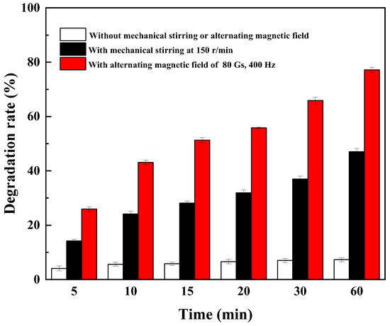 In order to compare the advantages of alternating magnetic fields, catechins were degraded at a sucrose concentration of 250 g/L, reaction temperature of 35 °C, immobilized laccase dosage of 1.0 mg/mL, and catechin concentration of 0.8 mmol/L; the reaction system was 50 mL. The different treatment conditions were as follows: (1) best alternating magnetic field conditions: 80 Gs and 400 Hz; (2) mechanical agitation: 150 r/min; and (3) no external magnetic field and mechanical agitation, static reaction. The catechins were sampled at 10, 30, and 60 min, and the catechin degradation rates were determined under different treatment conditions [4,24].