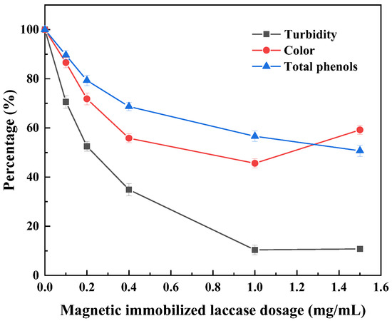 Figure 2d shows that the degradation efficiency in terms of total phenols, turbidity, and color increased with an increase in the immobilized laccase concentration. This is mainly because with an increase in the amount of magnetically immobilized laccase, the number of catalytically active sites of immobilized laccase increased and the contact probability between the substrate and laccase increased, resulting in an increase in the total phenol degradation rate and decolorization rate and a decrease in turbidity. When the dosage of magnetic immobilized laccase was 1.0 mg/mL, the total phenol degradation rate was 37.9%, the turbidity decreased by 80.3%, and the decolorization rate was 47.6%. When the dosage of magnetic immobilized laccase was 1.5 mg/mL, the total phenol degradation rate was 39.9%, the turbidity decreased by 84.4%, and the decolorization rate was 52.8%. The clarification effect increased slightly but not significantly. Guo et al. studied the effect of pectinase on juice clarification and found that the effect on juice clarification was significantly improved by increasing the amount of enzyme [32]. Therefore, considering the degradation of total phenols, clarification effect, and process economy, magnetically immobilized laccase at a concentration of 1.0 mg/mL was selected as the optimal dosage for the clarification of sugarcane juice.