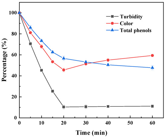 Under the condition of an alternating magnetic field, the total phenol content in the sugarcane juice decreased by 43.4% after 20 min, and the turbidity also reached the optimal treatment effect at 20 min, decreasing by 89.7% (Figure 11). With the prolongation of the treatment time, the total phenol content decreased slowly, and the turbidity did not notably decrease. The color value of the sugarcane juice reached its lowest at 20 min, decreasing by 54.4%, and a prolonged reaction time resulted in the formation of soluble oligomers, with the color value showing an upward trend. Therefore, under the optimum alternating magnetic field, the clarifying effect on the sugarcane juice was greatly improved, and the processing time was shortened from 30 min to 20 min compared to that under shaking conditions. The application of an alternating magnetic field can greatly improve the efficiency of sugarcane juice clarification, which may be due to the reduction in toxicity and space hindrance of polyphenol polymers to immobilize laccase with the help of movement under a magnetic field.