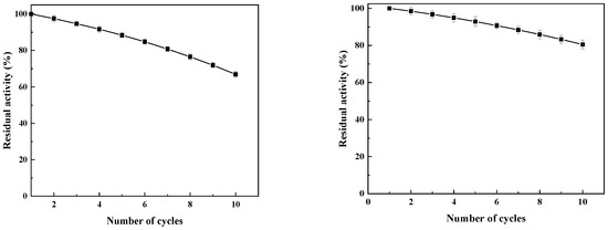 Under shaking conditions, the residual activity of the magnetic immobilized laccase was 66.9% after 10 consecutive batches of sugarcane juice clarification (Figure 12). The decrease in enzyme activity may be due to mechanical damage from prolonged processing of sugarcane juice during clarification, leading to the inactivation of immobilized laccase during recycling. In addition, the repeated use of phenolic degradation products during clarification can also inhibit enzyme activity [4]. Under an alternating magnetic field, the residual activity of the magnetic catalyst reached 80.5% of the initial enzyme activity after 10 recycling batches. Compared to the results under shaking conditions, the enzyme’s reuse performance under an alternating magnetic field was greatly improved, which may be due to the reduction in the single batch reaction time and lower inhibition of the product, resulting from the magnetic catalysts motion in the alternating magnetic field.