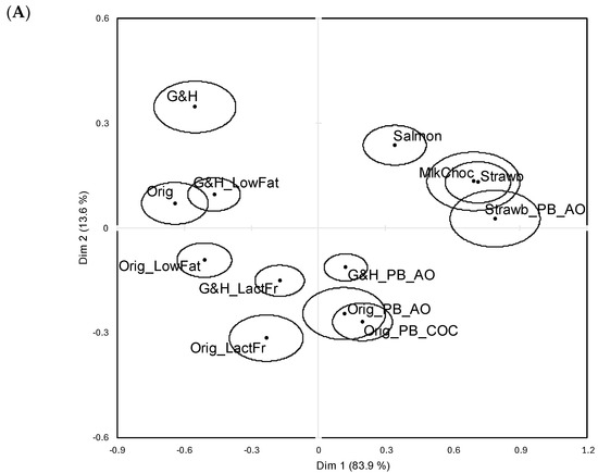 | Cream cheese, milk chocolate flavour | MlkChoc | −1.74 (HI) | 2.59 (H) | −1.4 (F) | −2.1 (H) | −2.4 (H) |