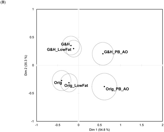 | Cream cheese, garlic and herbs flavour, lactose-free | G&H_LactFr | 0.27 (E) | 4.81 (D) | −1.1 (DEF) | 0.9 (E) | 0.1 (D) |