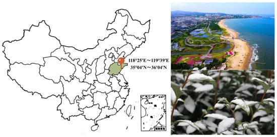 Green tea is the most consumed and produced tea product in China, eith widespread appreciation from consumers around the globe for its delightful flavor. The quality of tea is intricately linked to factors such as the planting environment, climate, soil and geography [1]. Consequently, green teas from China’s northern regions exhibit distinctive flavor profiles that set them apart from their southern counterparts [2,3]. Rizhao green tea (RZT) is among the few highly esteemed green tea products cultivated in the northernmost tea region of China (35°04′ N–36°04′ N) (Figure 1). By 2023, Rizhao’s total tea planting area had grown to 20,000 hectares, producing over 19,800 tons of Rizhao green tea with an output value of CNY 3.8 billion. The unique growing conditions at this latitude, characterized by a humid maritime monsoon climate, low-temperature stress, and pronounced diurnal temperature fluctuations, result in the slower but more robust growth of RZT tea leaves and buds. Accordingly, these unique environments provide it with some special flavor characteristics different from those of the green tea grown in other tea regions in China, especially reflected in the RZT aroma quality: a rich chestnut- and seaweed-like aroma.