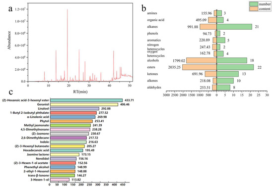 Result of volatile compounds in RZT identified by SBSE-GC-MS. (a) A representative total ion flow diagram of the RZT sample. (b) Volatile profiles of RZT samples. The left part of the figure shows the content of each volatile category, and the right part shows the number of volatiles in each category. (c) Details of volatile compounds with high contents (>100 μg/kg).