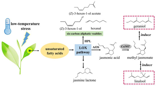 Effects of low-temperature stress on volatiles in fresh leaves of RZT (speculated). LOX: lipoxygenase; HPL: hydroperoxide lyases; AOS: allene oxygenase; JMT: JA carboxyl methyltransferase.