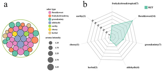 The results of GC-O analysis. (a) Circle packing plots of the odorants. (b) Radar map of the odorants. The X-axis represents the aroma type and number of corresponding compounds in that type, while the Y-axis represents the cumulative aroma intensity of different types of odorants.