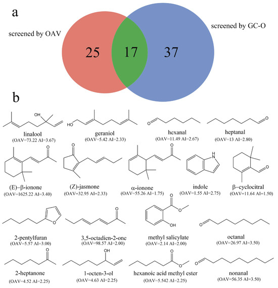 Key odorants based on OAV calculations and GC-O analysis in RZT. (a): a venn diagram of key odorants identified by OAV calculations and GC-O analysis. (b): chemical structure of 17 key odorants with dual verification of OAV and GC-O (the unknowns in GC-O cannot be categorized as key odorants because their names and chemical structures were not clear).