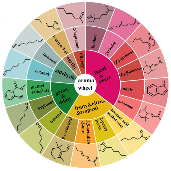 The aroma wheel served as a visual and intuitive tool for categorizing diverse types of flavor descriptions [61]. Currently, it is used in flavor research on beverages and condiments such as wine, coffee, and soy sauce [62,63,64]. The development of an aroma wheel can shed light on the chemical foundation of the distinctive aromatic qualities of RZT.