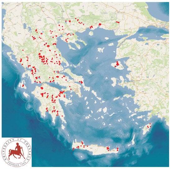 Locations of the 444 small ruminant farms across Greece (red dots), wherein the presence of C. burnetii genetic material was studied.