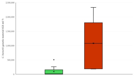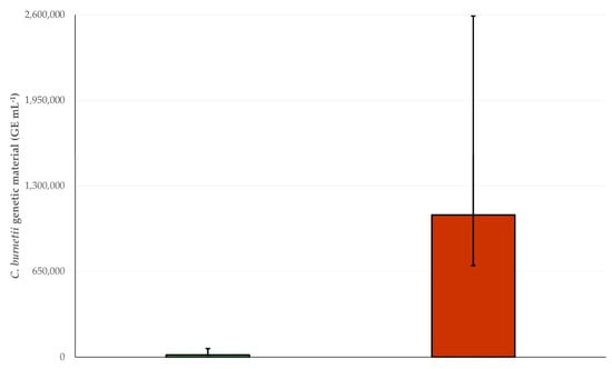 For the qualitative and the quantitative identification of C. burnetii genetic material, a commercially available test (bactotype C. burnetii PCR Kit; Indical BioScience, Leipzig, Germany) was used. The test was performed according to the manufacturer’s protocol. The DNA standard that contained C. burnetii DNA was serially diluted to make a standard curve for the quantification of the positive samples. The qPCR was performed in a RotorGene Q (Qiagen; Hilden, Germany), in a 25 μL reaction volume, by adding 5 μL of the extracted DNA and 20 μL of the master mix. qPCR conditions were set as follows: an initial denaturation step for 5 min at 95 °C, followed by 40 cycles of a denaturation step (10 s at 95 °C), and an annealing/extension step (30 s at 57 °C). Fluorescence collection was performed on the second step of the reaction. The quantity of C. burnetii DNA, expressed in genome copies, was calculated according to the manufacturers’ protocol by using the Cq values and the standard curve.