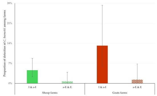 C. burnetii genetic material was detected in significantly more samples from farms that applied the intensive or semi-intensive management system rather than in samples from farms that applied the semi-extensive or extensive management system: in thirteen (13) (5.9% (95% CI: 3.5–9.8%)) versus two (2) (0.9% (95% CI: 0.3–3.2%)) farms overall (p = 0.004). Similar findings were seen for sheep (eight (8) and one (1) farm, respectively) and goats (five (5) and one (1) farm, respectively) (p < 0.048 for both comparisons) (Figure 4).