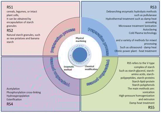 The preparation method is a crucial factor influencing the yield of RS, which can be categorized into physical, chemical, and enzymatic methods based on their principles. The preparation method and yield of resistant starch are shown in Table 2 [46]. Physical methods are advantageous in terms of low cost, environmental friendliness, and safety. They primarily include two aqueous heat treatment processes (heat-moisture treatment and annealing treatment) and various non-aqueous heat treatment processes (autoclaving, ultrasonic treatment, microwave treatment, high-pressure homogenization, etc.) [47]. Chemical methods mainly involve acid hydrolysis, crosslinking treatment, esterification, acetylation, etc., introducing new functional groups through chemical modification to alter the original physicochemical properties of starch. The different types of resistant starch are shown in Figure 1 [48].