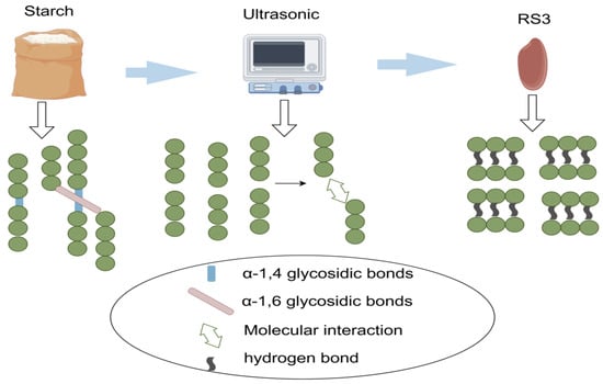Preparation of RS3 using the microwave method. After microwave treatment, the α-1,4-glycosidic bonds in starch are broken and then recombined through intermolecular interactions to form starch structures connected by hydrogen bonds.