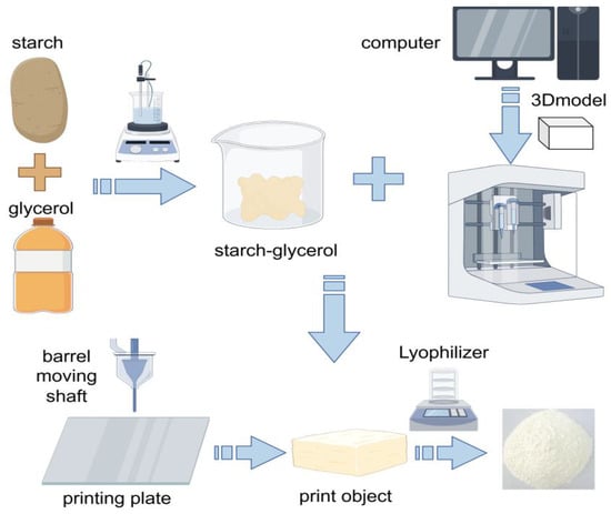 For 3D printing, it is necessary to choose suitable resistant starch raw materials, such as high amylose corn starch, etc., that have high resistant starch content and specific physical and chemical properties and can show good formability and stability in the 3D printing process [102], and it is also necessary to add some auxiliary materials such as plasticizer glycerin, which can improve the flexibility and fluidity of starch, making it easier to extrude and shape in the printer [103]. Then, the resistant starch is thoroughly mixed with the auxiliary material. This can usually be achieved by mechanical stirring or high-speed mixing, as shown in Figure 3; for example, heat treatment can change the internal structure of starch granules and enhance their mechanical strength; enzymatic hydrolysis can adjust the length of the starch molecular chain and improve fluidity. After the mixed material is placed in the print cylinder, it needs to be properly pretreated, and the heating temperature can be controlled at 60–80 °C for 10–30 min [104]. The parameter settings of the printer mainly include extrusion temperature and printing speed. Depending on the properties of the resistant starch and auxiliary materials, the extrusion temperature is usually set between 60 and 180 °C. Higher temperatures help with the melting and extrusion of starch, but too high temperatures may cause starch degradation and affect product quality [105]. The printing speed is generally adjusted in the range of 10–50 mm/sec. A slower printing speed can ensure printing accuracy, but it will increase the printing time; faster printing speeds may lead to a decrease in molding quality, which needs to be optimized according to the specific printing model and requirements [106].