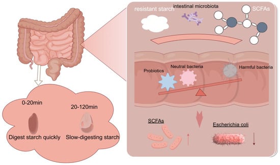 RS is fermented by gut microbiota in the large intestine, producing SCFAs such as acetate, propionate, and butyrate, among which butyrate plays a crucial role in improving gut health. A schematic diagram of resistant starch fermentation in the gut is shown in Figure 4. Butyrate is the most abundant SCFA produced during the digestion of RS, and it promotes the proliferation of normal colonic cells while inhibiting the proliferation of cancer cells [131]. SCFAs exert various effects on the human body, including lowering blood cholesterol and triglyceride levels, providing energy for colonic cells, and maintaining an appropriate colonic epithelial state [132]. Studies have shown that SCFAs serve as a link between gut microbiota and RS, as RS can improve the metabolism of gut microbiota, increase the abundance of beneficial microorganisms in the intestine, and reduce the abundance of harmful microorganisms such as Escherichia coli [133].