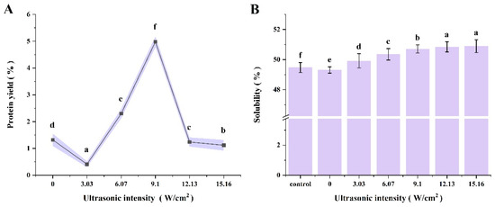 Changes in ultrasonic intensity and their impact on (A) yield and (B) solubility. Different letters (a–f) indicate significant differences (p ≤ 0.05).