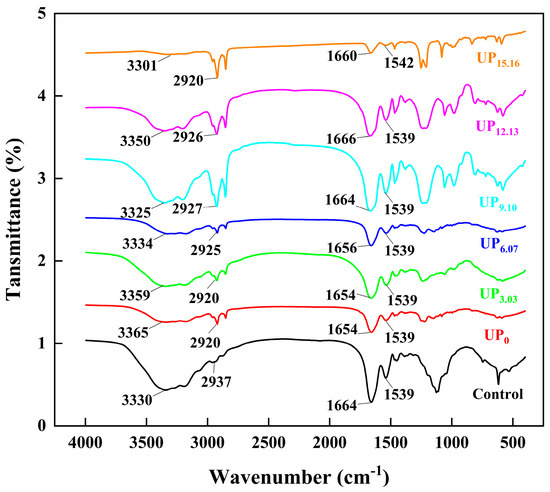 Changes in ultrasonic intensity and their impact on infrared spectra of CPP proteins during ultrasound-assisted acidic extraction. The control was a commercially available standard and UP indicates samples treated at each ultrasonic intensity.