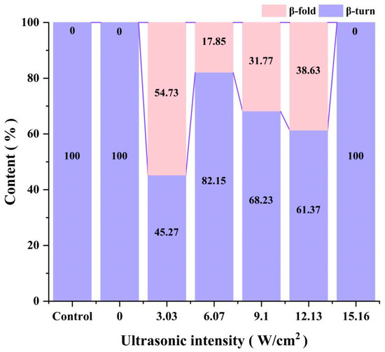 CPP samples treated with different ultrasonic intensities were processed and measured using the method of Wang [14]. Briefly, the sample was KBr = 1:100 and the spectral range was 4000–400 cm−1 (Fourier Infrared Spectrometer, FTIR, Thermo Fisher, Thermo Fisher Scientific, Waltham, MA, USA). The infrared spectra of each CPP sample in the protein amide I band, typically observed in the range of 1700–1600 cm−1, were resolved, and the relative amounts of secondary structure were expressed as the relative percentages of α-helix, β-sheet, β-turn, and random curl.