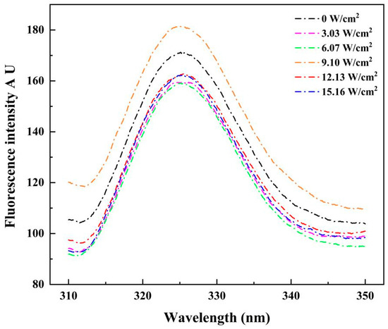 Endogenous fluorescence is a commonly used technique for testing reactions to the tertiary structure of proteins, relying mainly on Trp (tryptophan)/Tyr (tyrosine). The intensity of the fluorescence emitted was sensitive to polarity or the local environment [9]. The tertiary structure of CPP extracted at different ultrasonic intensities was evaluated using endogenous fluorescence, as shown in Figure 4. The intrinsic fluorescence spectra were similar across all samples, with the maximum absorption peak observed at 325 nm. The fluorescence intensity was maximum when the ultrasonic intensity was 9.10 W/cm2, which was higher than that of the group without the use of ultrasound treatment. This was due to the fact that as the ultrasound energy increased, the energy generated by ultrasound caused the protein structure to unfold moderately and the tryptophan residues on the surface of the protein were exposed. However, the fluorescence intensity gradually decreased when the ultrasonic intensity was too high. This may be due to the oxidation of the Trp fraction [31], which may also be the result of excessive ultrasound energy causing the protein structure to fold, disrupting protein hydrophobic interactions and reducing the exposure of amino acid residues on the outside of the protein [32]. In addition, excessive ultrasound energy may lead to the folding of the protein structure, the formation of polymers, and a reduction in fluorescence intensity [33], which would be similar to previous findings [14]. Similar reductions were found for endogenous fluorescence of myofibrillar proteins from black soldier fly and black bean proteins by Ni [13] and Jiang [34].