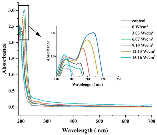 The variation in the UV spectra of CPP extracted using different ultrasonic intensities is shown in Figure 5. The highest absorption peak near 210 nm was associated with the carbonyl, carboxyl, and amide groups, associated with triple helices in the polypeptide chain of protamine [35]. All of the samples of CPP showed absorption peaks around 196 nm, which is consistent with the results observed in Thunnus alalunga collagen [13]. At ultrasonic intensities of 12.13 and 15.16 W/cm2, there was only an absorption peak at 196 nm, which could be attributed to the fact that ultrasonic waves generated by excessive ultrasonic intensities caused structural changes in the protein structure of CPP, which resulted in refolding and irreversible damage, exhibiting aggregation and gelling, and yielding similar results. The structural changes in the proteins caused changes in the relevant functional properties, which was also confirmed by the results of the bacteriostatic and heparin titration experiments below. In addition, a weak absorption peak was observed at 260 nm, suggesting that the tryptophan and tyrosine content in CPP was relatively low. This finding was in general agreement with that of Ni et al. [13].
