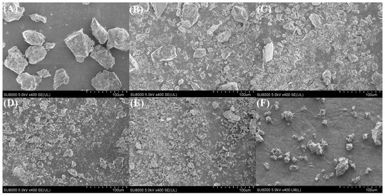 Effect of ultrasonic intensity on the change in SEM apparent morphology of CPP protein during ultrasound-assisted acidic extraction, where A–E represent samples with ultrasonic intensities: (A) 0 W/cm2, (B) 3.03 W/cm2, (C) 6.07 W/cm2, (D) 9.10 W/cm2, and (E) 12.13 W/cm2; (F) 15.16 W/cm2.
