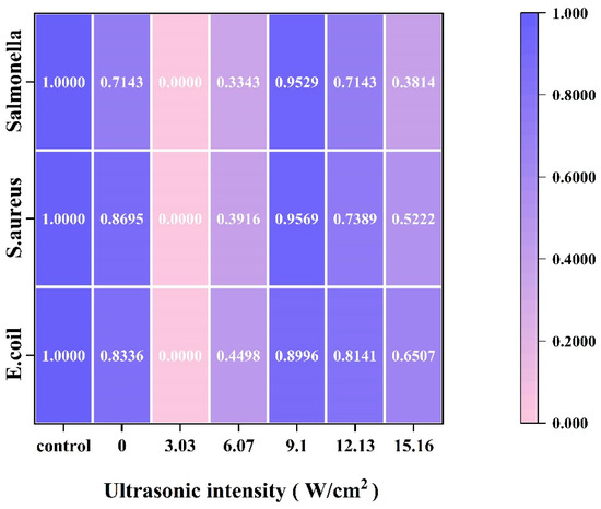 The size of the inhibition circle was a common factor in indicating the magnitude of the inhibitory activity of CPP proteins. As shown in Figure 8, using a heat map to represent the inhibition effect, we defined the diameter of the inhibition circle of the standard as 1, and the inhibition effect was obtained by normalizing the rest of the treatment groups (ultrasonic intensity: 0, 3.03, 6.07, 9.10, 12.13, and 15.16 W/cm2). The better the bacteriostatic effect, the darker the color. As shown in Figure 5, with the increase in ultrasonic intensity, the bacteriostatic activity of CPP first increased and then decreased. When the ultrasonic intensity was low (<9.10 W/cm2), the bacteriostatic effect of the CPP protein was poor and even weaker than the bacteriostatic property of CPP (0 W/cm2) in the group without ultrasonic treatment. This might be due to the fact that at lower ultrasonic intensities, less energy was generated, the solution in the reaction system was less perturbed by the energy, thus less cavitation and microjets were generated, and the structure of the CPP protein was less affected. When the ultrasonic intensity was 9.10 W/cm2, the inhibition of the three bacteria in each treatment group showed strong inhibition, but this was slightly lower than the standard control group. This might be due to the fact that the increase in ultrasonic energy led to a moderate unfolding of the structure of protamine and a greater leakage of its arginine residues, which enhanced the destruction of the bacterial cell wall [40]. The bacteriostatic activity of CPP proteins gradually decreased with a further increase in ultrasonic intensity. This might be due to excessive ultrasound energy, resulting in changes in the protein structure. The inhibitory activity of the 9.10 W/cm2 ultrasonic intensity group, which had the strongest inhibitory activity among the ultrasound treatment groups, was slightly lower than that of the standard control group. This might be due to the fact that the purity of the CPP was affected by the extraction method, which was lower than the purity of the purchased standard protamine. In addition, CPP showed stronger inhibitory activity against S. aureus and Salmonella than E. coli, which was in agreement with the findings of Lesmes et al., showing that the inhibitory effect of protamine on Gram-positive bacteria was more pronounced [41].