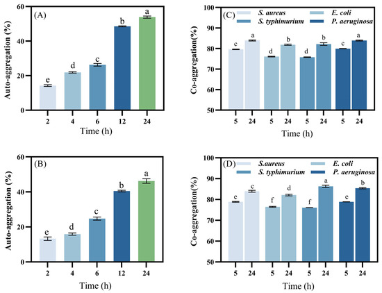The co-aggregation ability of LAB reflects their capacity to adhere to specific strains. This characteristic plays a crucial role in eliminating the colonization of pathogens by preventing them from attaching to host tissues [31]. Figure 2B,D illustrates the co-aggregation ability of L. plantarum LR5-2 and L. rhamnosus SQ63, respectively. The data show that both strains achieved high co-aggregation levels within 5 h for E. coli, S. aureus, P. aeruginosa, and S. typhimurium, with co-aggregation rates exceeding 75%. After 24 h, the co-aggregation ability increased to more than 80%. This is consistent with the findings of Divyashree et al. [30], confirming that the two strains can quickly adhere to various pathogens, thereby inhibiting their attachment in the host tissues in the gastrointestinal tract. Furthermore, these strains produce antimicrobial compounds that significantly reduce or eliminate harmful microorganisms [42].
