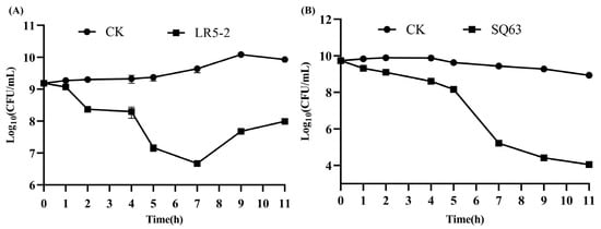 The strains LR5-2 and SQ63 were identified through 16S rDNA sequencing performed by BGI Genomics Institute (Beijing, China). Total genomic DNA was extracted [28], and PCR (polymerase chain reaction) was performed using universal primers (27F: 5′AGAGTTTGATCCTGGCTCAG-3′ and 1492R: 5′-TACGGYTACCTTGTTACGACTT-3′). The resulting product was sequenced in the 16S rDNA gene region, and the isolates were identified through sequence alignment using the NCBI BLAST platform. The query coverage and percent identity of LR5-2 are both 100%, while the query coverage and percent identity of SQ63 are 99% and 99.12%, respectively. These values significantly surpass those of other bacterial species in terms of sequence coverage and similarity.