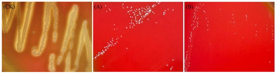 Some strains produce hemolysin, an enzyme that lyses red blood cells, potentially causing internal defects, antigen–antibody reactions, anemia, and other health issues [71]. Therefore, hemolytic activity is a critical safety indicator when evaluating LAB. The hemolytic activity of L. plantarum LR5-2 and L. rhamnosus SQ63 is presented in Figure 7. A positive result was confirmed for CK (S. aureus), as clear zones were observed around its colonies. In contrast, both L. plantarum LR5-2 and L. rhamnosus SQ63 formed milky white colonies without visible hemolytic zones, indicating negative results. These findings suggest that L. plantarum LR5-2 and L. rhamnosus SQ63 do not exhibit hemolytic activity and are unlikely to cause damage to blood cells.