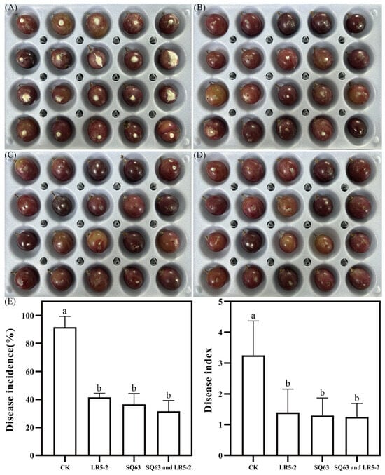 Effects of isolated strains on biological control of P. expansum in table grapes. (A) Fermentation broth without probiotics, (B) L. plantarum LR5-2 fermentation broth, (C) L. rhamnosus SQ63 fermentation broth, (D) L. plantarum LR5-2 + L. rhamnosus SQ63 fermentation broth, and (E) disease incidence and disease index of grape. The different lowercase letters indicate significant differences between the mean values compared (p < 0.05).