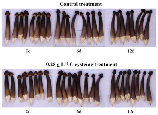 The appearance quality of differentially treated fresh-cut Changgen mushrooms. During the storage period, time points of 0, 6 and 12 d were selected to show the appearance difference between 0.25 g L−1 L-Cys treatment and the control treatment.