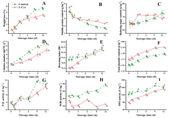 Changes in weight loss (A), soluble protein (B), reducing sugar (C), colonies number (D), BI (E), total phenolic (F), PAL activity (G), POD activity (H) and PPO activity (I) of differentially treated fresh-cut Changgen mushrooms. The horizontal coordinate indicates the storage time, and the vertical coordinate indicates the value of an indicator. The solid red line represents the L-Cys treatment, and the dotted green line represents the control treatment. Bars represent standard deviation (±SD). The same letters represent no significance, and different letters represent statistically significant differences (p < 0.05).