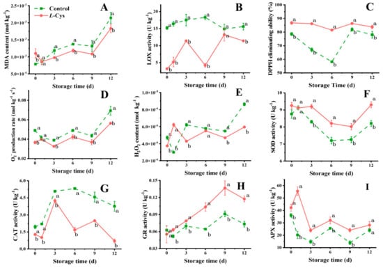 Changes in MDA (A), LOX activity (B), DPPH eliminating ability (C), O2− production rate (D), H2O2 content (E), SOD activity (F), CAT activity (G), GR activity (H) and APX activity (I) of differentially treated fresh-cut Changgen mushrooms. The horizontal coordinate indicates the storage time, and the vertical coordinate indicates the value of an indicator. The solid red line represents the L-Cys treatment, and the dotted green line represents the control treatment. Bars represent standard deviation (±SD). The same letters represent no significance, and different letters represent statistically significant differences (p < 0.05).
