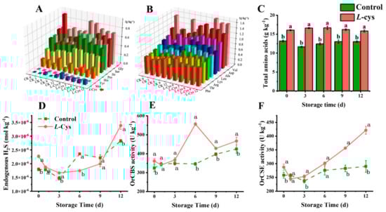 Changes in 16 amino acids (A,B), total amino acids (C), endogenous H2S content (D), OrCBS activity (E) and OrCSE activity (F) of differentially treated fresh-cut Changgen mushrooms. The X axis indicates the storage time of different treatments, the Y-axis indicates the class of amino acids and the Z axis indicates the content of various amino acids. The amino acids indicated by the red arrow are sulfur-containing amino acids, which are essential precursors for H2S synthesis. (A,B). The horizontal coordinate indicates the storage time, and the vertical coordinate indicates the value of an indicator. The red column represents the L-Cys treatment, and the green column represents the control treatment (C). The solid red line represents the L-Cys treatment, and the dotted green line represents the control treatment (D–F). Bars represent standard deviation (±SD). The same letters represent no significance, and different letters represent statistically significant differences (p < 0.05).