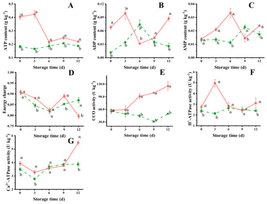 Changes in ATP content (A), ADP content (B), AMP content (C), EC level (D), CCO activity (E), H+-ATPase activity (F) and Ca2+-ATPase activity (G) of differentially treated fresh-cut Changgen mushrooms. The horizontal coordinate indicates the storage time, and the vertical coordinate indicates the value of an indicator. The solid red line represents the L-Cys treatment, and the dotted green line represents the control treatment. Bars represent standard deviation (±SD). The same letters represent no significance, and different letters represent statistically significant differences (p < 0.05).
