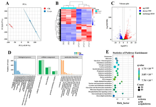 The transcriptome analysis was conducted to identify differentially expressed genes (DEGs) between the L-Cys and control samples. Principal component analysis (PCA) analysis showed a distinct separation between the groups, as depicted in the PC1 and PC2 score plots, signifying a high level of replication correlation (Figure 6A). The heatmap further illustrated a significant disparity in the DEGs profiles between the two groups, with a discernible consistency across biological replicates (Figure 6B). A total of 3898 DEGs were identified, with 2198 up-regulated and 1709 down-regulated genes (Figure 6C). The GO enrichment analysis was performed to examine the biological functions associated with the DEGs. The results indicated that exogenous L-Cys regulated the antioxidant activity, nutrient reservoir activity and small molecular sensor activity in Changgen mushrooms (Figure 6D). KEGG pathway enrichment analysis elucidated the most significantly enriched pathways, including proteasome, carbon metabolism, cysteine and methionine metabolism (Figure 6E).