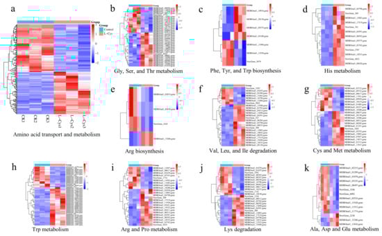 A total of 189 DEGs were involved in amino acid transport and metabolism (Figure 7a), which were categorized into 10 distinct groups (Figure 7b–k). There were also 26 DEGs enriched in Cys and Met metabolism (Figure 7g). Meanwhile, the tryptophan and histidine metabolic pathways enriched 53 and 13 DEGs, respectively (Figure 7d and Figure 7h). These transcriptional regulation findings further validate the influence of L-Cys on amino acid content.