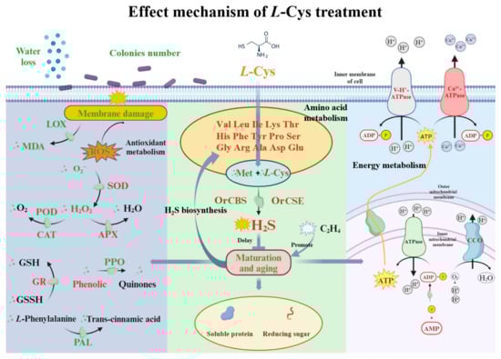 In summary, fresh-cut Changgen mushrooms, a popular ready-to-eat product, face significant challenges in preservation due to their rapid quality deterioration. In the present study, the utilization of the natural preservative L-Cys has demonstrated promising potential in addressing these challenges. As shown in Figure 8, exogenous L-Cys treatment was effective in retarding the weight loss, browning degree, nutrition depletion and microbial contamination. Notably, exogenous L-Cys significantly stimulated the metabolism of 17 amino acids, among which the endogenous L-Cys and Met serveas the gaseous signaling molecule H2S biosynthesis precursors. Subsequently, it was discovered that an increase in endogenous H2S levels, as well as enzymatic activities and gene expressions of the OrCBS and OrCSE, was triggered. Furthermore, L-Cys enhanced energy metabolism by improving CCO, Ca2+-ATPase and H+-ATPase enzymes activity. Additionally, L-Cys treatment improved the ROS by regulating enzyme activities such as polyphenol oxidase, catalase and superoxide dismutase. This study contributed valuable insights to the mechanisms of the green preservation agent L-Cys on the fresh-cut edible mushroom.