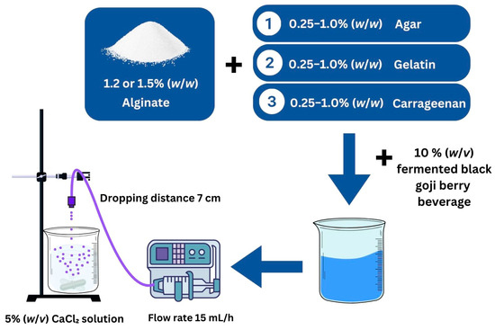 The encapsulation process was adapted from previous reports with slight modifications [20]. The formulations included sodium alginate (Ag) combined with the fermented BGB beverage, sodium alginate with carrageenan (Ag + C), sodium alginate with agar (Ag + A), and sodium alginate with gelatin (Ag + G). Sodium alginate solutions (1.2% and 1.5% w/w) were prepared by dissolving alginate in sterile distilled water at 60 °C under magnetic stirring for 60 min until a homogeneous solution was achieved. Various quantities (0.25, 0.5, and 1 g) of carrageenan, agar, or gelatin were added to 100 g of the sodium alginate solution. Then, 10 mL of the 10% (w/v) fermented BGB beverage was incorporated, and the mixture was gently stirred to ensure homogeneity and eliminate air bubbles.