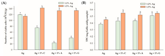 (A) Viability of Lactobacillus rhamnosus GG (LGG) and (B) total polyphenol content (TPC) in the encapsulated beads, comparing 1.2% alginate (Ag) and 1.5% Ag with 1% hydrocolloids. Data are expressed as the mean ± standard error of the mean (SEM) (n = 3). Different letters indicate significant differences between 1.2% Ag and 1.5% Ag at p < 0.05. C: carrageenan; A: agar; G: gelatin.