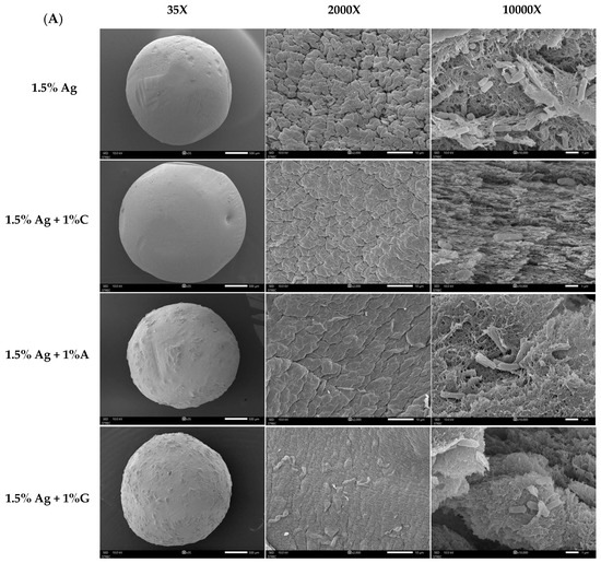 Figure 3A presents SEM images of the encapsulated beads, highlighting their surface and cross-sectional features at various magnifications (35×, 2000×, and 10,000×). Although all formulations exhibited a spherical shape, differences in the surface texture and internal structure were evident based on the co-encapsulation materials used. Beads containing 1.5% alginate (Ag) showed a low-density structure with a porous surface and interior. This less compact matrix is likely to result in reduced probiotic retention and weaker encapsulation stability, potentially compromising the protection of the encapsulated bacteria. In comparison, beads made with 1.5% Ag + 1% carrageenan (C) had smoother surfaces and a denser internal structure with smaller pores. These features indicate enhanced gel strength and internal cohesion, making the carrageenan–alginate matrix more effective at retaining probiotics. The 1.5% Ag + 1% gelatin (G) beads showed an elastic matrix with moderate surface improvements [32]. While the surface was smoother than pure alginate beads, it was not as compact as the carrageenan formulation. Internally, the gelatin combination formed a thicker, layered structure, adding flexibility to the gel matrix and offering moderate protection for the encapsulated probiotics. Lastly, beads made with 1.5% Ag + 1% agar (A) exhibited a rigid matrix with a dense surface and a highly compact internal structure with minimal voids. The rigid nature of the alginate–agar combination provides superior mechanical stability, which is advantageous for probiotic retention under adverse conditions [33].