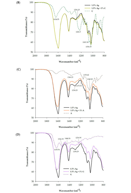 (A) Scanning Electron Microscopy (SEM) images of 1.5% Ag (alginate), 1.5% Ag + 1% C (carrageenan), 1.5% Ag + 1% A (agar), and 1.5% Ag + 1% G (gelatin) encapsulated beads. The overall structure is shown at 30× magnification (left), surface morphology at 2000× magnification (middle), and cross-section at 10,000× magnification (right). (B) FT-IR spectra of 1.5% Ag, 1.5% Ag + 1% C, and C encapsulated beads. (C) FT-IR spectra of 1.5% Ag, 1.5% Ag + 1% A, and A encapsulated beads. (D) FT-IR spectra of 1.5% Ag, 1.5% Ag + 1% G, and G encapsulated beads.