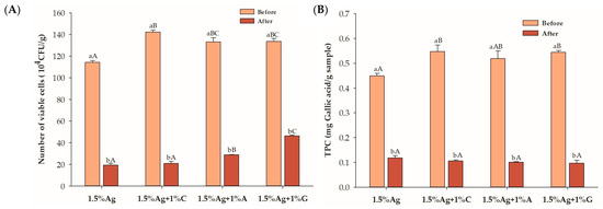 (A) Viability of Lactobacillus rhamnosus GG (LGG) and (B) total polyphenol content (TPC) in the encapsulated beads before and after 180 min of in vitro simulated gastric and intestinal digestion. Data are expressed as the mean ± SEM (n = 3). Different letters indicate statistically significant differences at p < 0.05. Uppercase letters (A–C) indicate comparisons between 1.5% Ag, 1.5% Ag + 1% C, 1.5% Ag + 1% A, and 1.5% Ag + 1% G before or after digestion. Lowercase letters (a,b) represent comparisons between before and after digestion within the same sample.