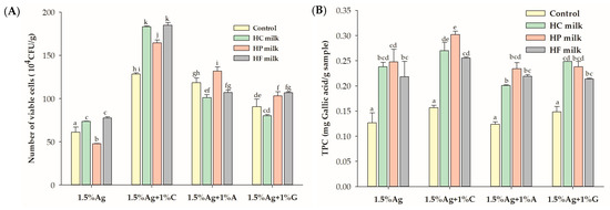 Effect of co-ingestion with different milk types (high carbohydrate (HC), high protein (HP), and high fat (HF)) on (A) the viability of Lactobacillus rhamnosus GG (LGG) and (B) total polyphenol content (TPC) in the encapsulated beads after in vitro simulated gastric and intestinal digestion. Control refers to beads in water. Data are presented as the mean ± standard error of the mean (SEM) (n = 3). Statistical differences are denoted by different superscript letters (p < 0.05).